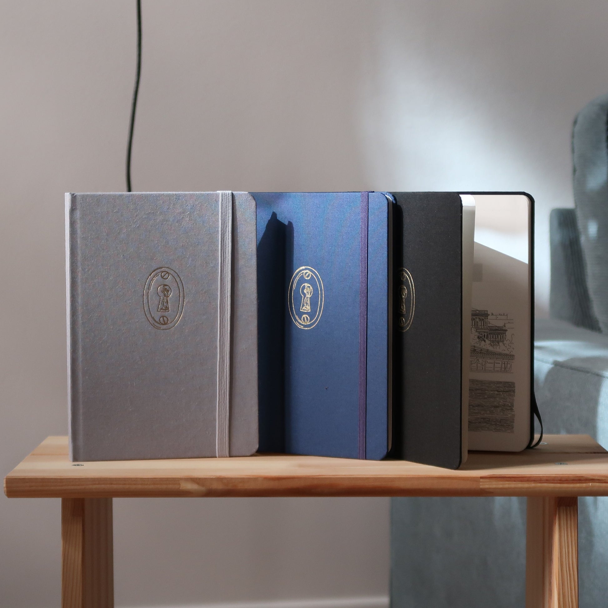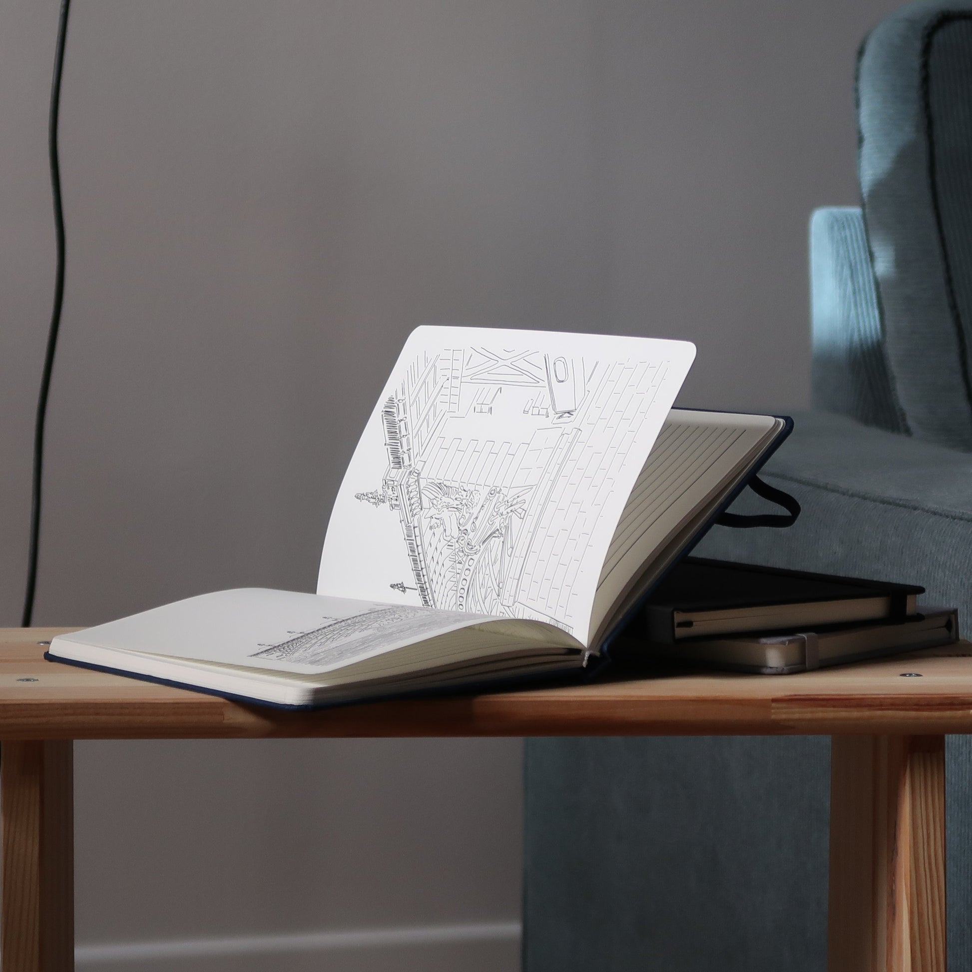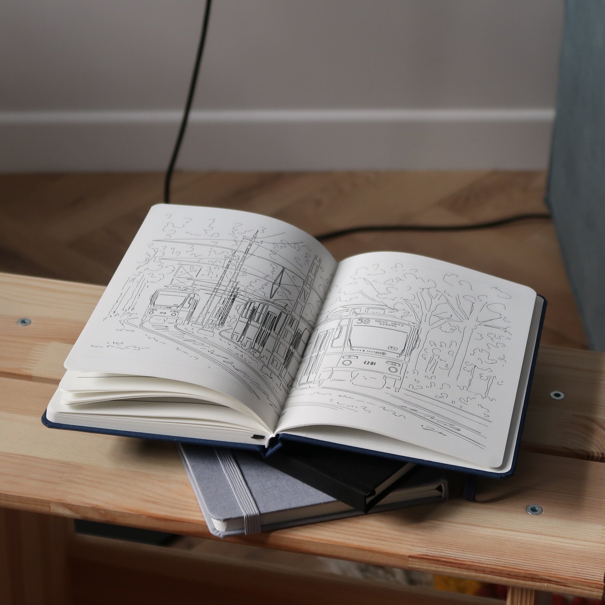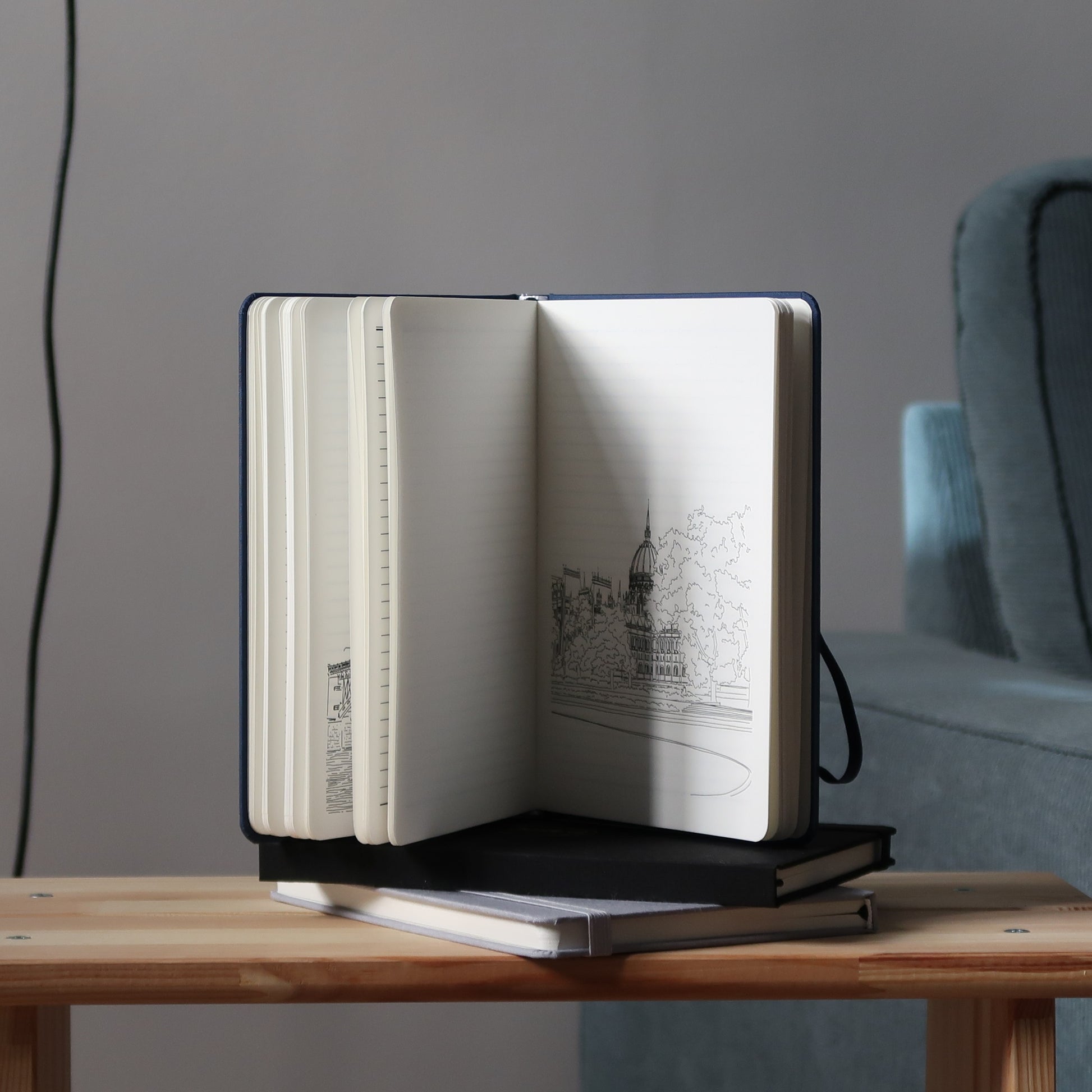 A vászonkötésű naplóban Budapest ikonikus épületeiről készült grafikáim köszönnek vissza.