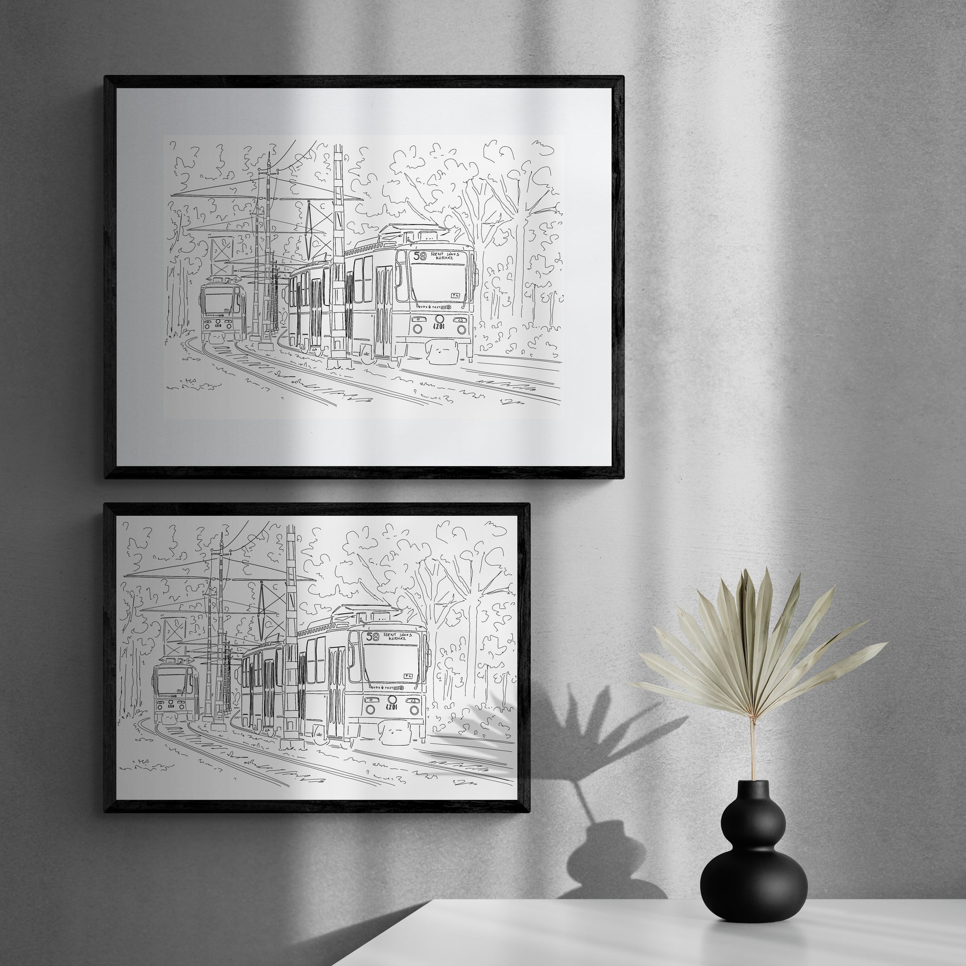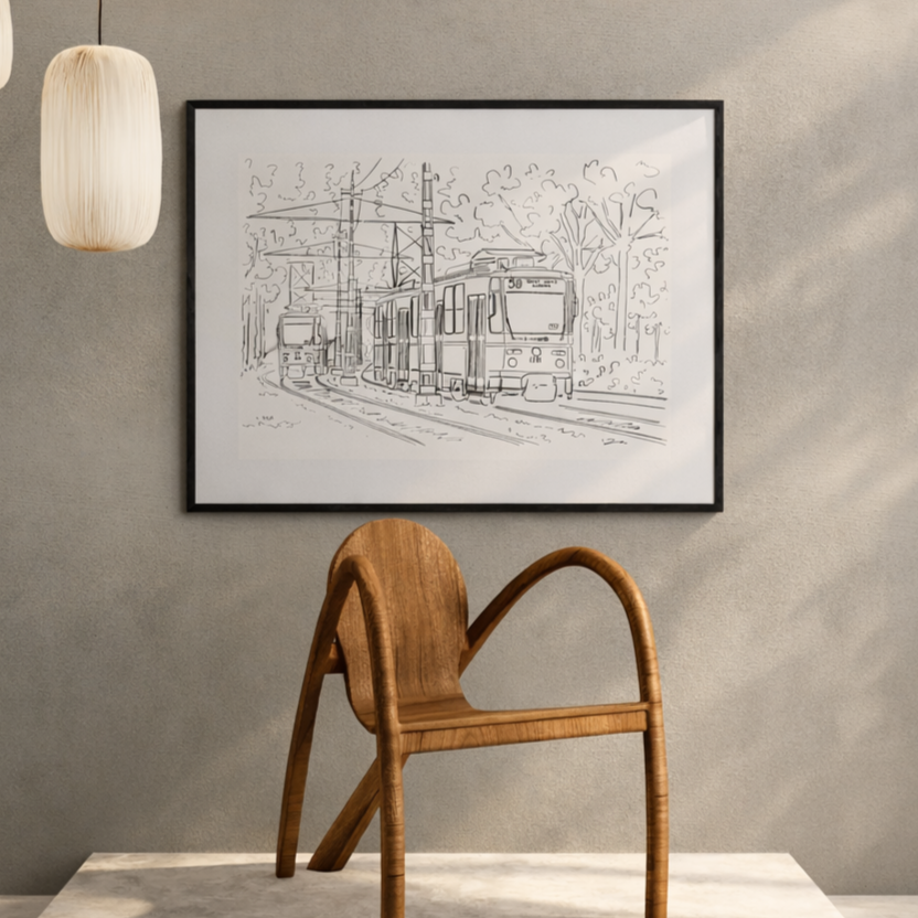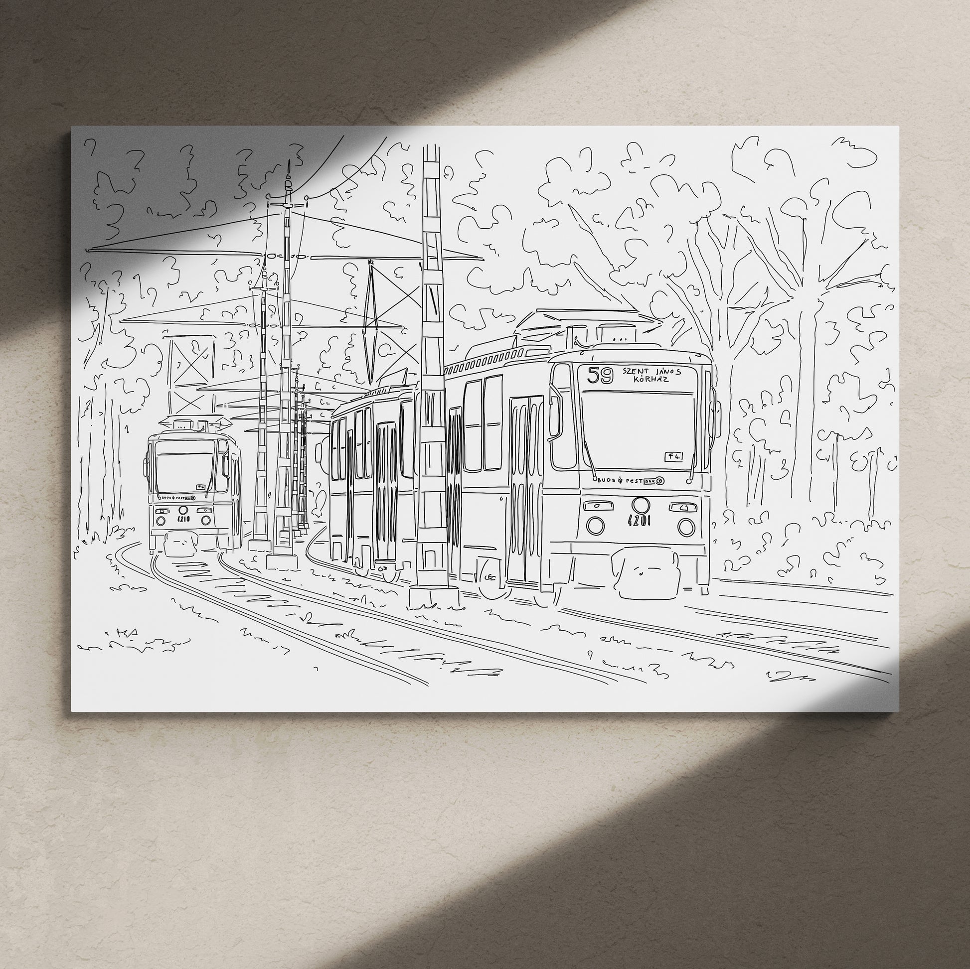 A Szilágyi Erzsébet fasor villamosairól készült rajzom többféle méretben magas minőségű, finom papírra nyomva.